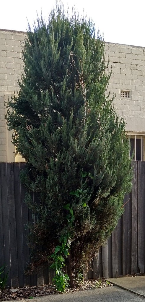 As I sat in my car, staring out through my windscreen across my driveway at the pencil pine tree that stands opposite my car space, this is what I saw:
