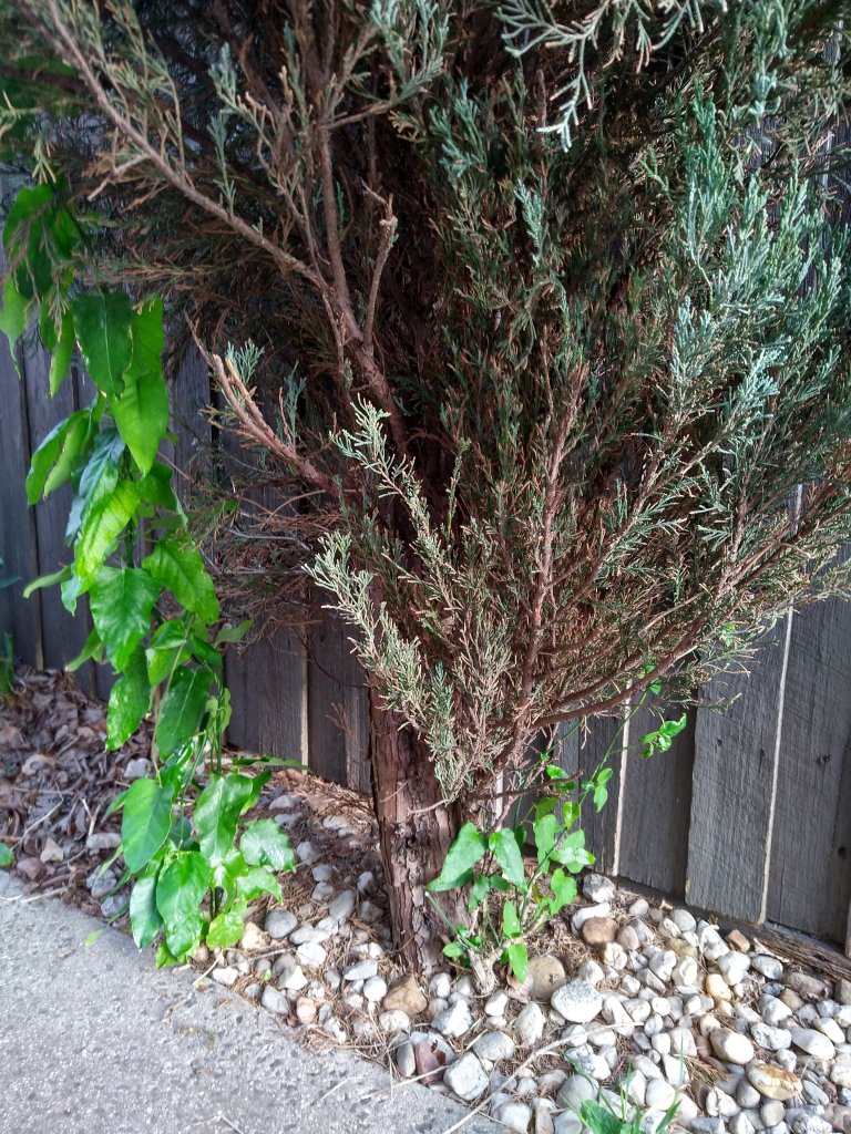 So here we have two healthy plants growing alongside each other, so closely side by side, that one was now growing into the other. But then I noticed some areas of darker growth on Pencil Pine lower down at the base. Getting out of my car to check it out up close, I noticed there is quite a bit of dead undergrowth.