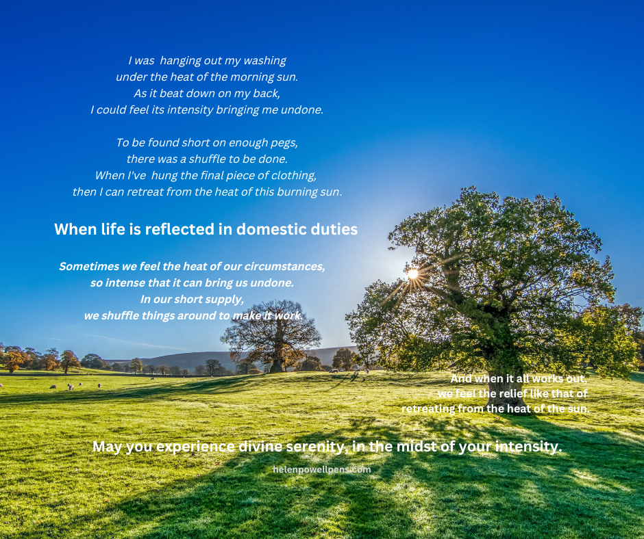 It was back in March earlier this year while at a client’s home working as a cleaner that I had a moment of reflection. On this particular day, I had noticed a load of clothes still in the washing machine. While my usual duties are only to fold and put away when dry, I decided to hang this wet load out anyway. It was while hanging out the washing, that I remembered a thought, a prayer, from a few days earlier …. thinking and praying about if and when a time would come where I would once again stand outside in my own backyard, with the warmth of the sun beaming down on my back, while hanging my clothes out on a real clothesline.
