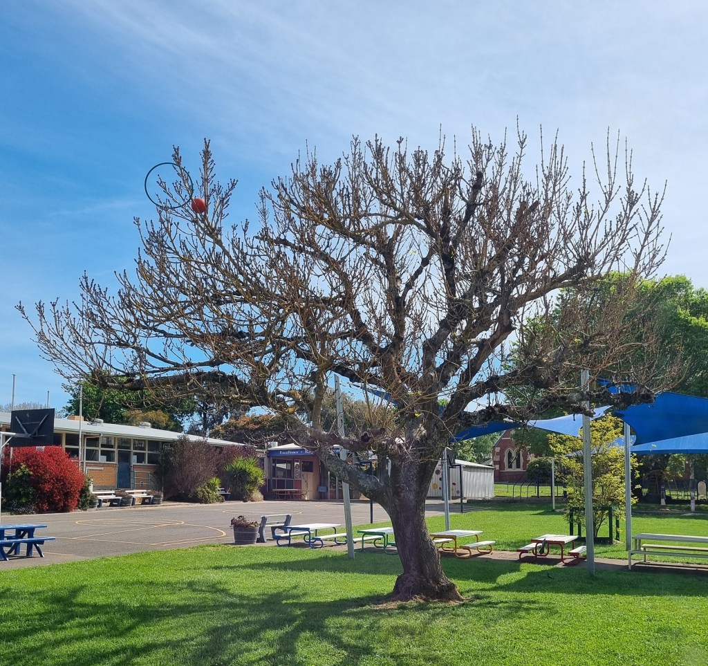 The tree’s branches are so stick like, that they just snap like a carrot. The tree has no leaves, like it’s dead. It’s still alive on the inside, but it looks dead on the outside. Where the birds sit and nest, and where school play items get stuck.