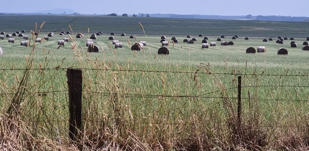 Then there’s paddocks and fencelines, hills near and mountains far. I really enjoy a paddock scattered with round hay bales, or ‘communities’ of cattle, some ‘chatting’ around the water trough, some seeking shade under trees, while others are ‘hanging out’ further afield. The sights of old farm sheds and cattle yards, maybe no longer used, with some mystery to their history, make me wonder about the stories they hold. Looking ahead, looking behind, there’s no-one approaching, the road is all mine. So I continue to set my own pace on this drive.