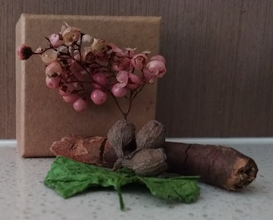 After trimming the branch of all its dead foliage and many of its finer twigs in order to remove the excess, I carried it to the car. Should I paint it silver? No, on closer inspection I like the colouring of the wood in its reds and browns and even some black areas, as if it’s been struck by fire at some time, but it all adds to the overall look.